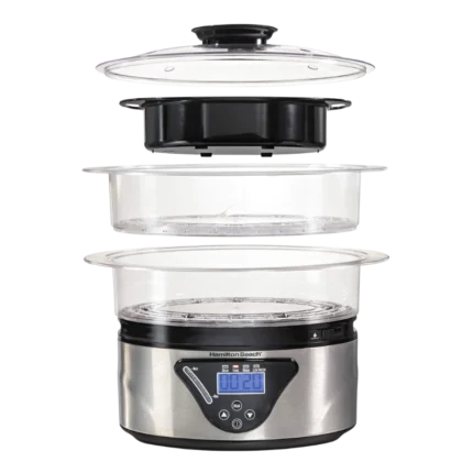 Make mealtime more exciting and nutritious with the Hamilton Beach Digital Steamer. Place the transparent bowls of your choice of vegetables, seafood, or chicken atop the base and set the cooking timer. When done, the steamer beeps and switches to warm. With a Food Steamer in your kitchen, you can take advantage of the bounty of healthy, in-season produce and reap the rewards and satisfaction of steaming your own fresh food.
