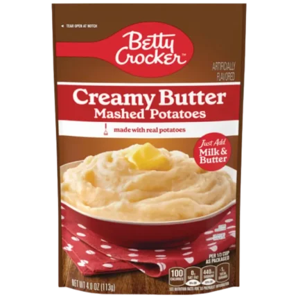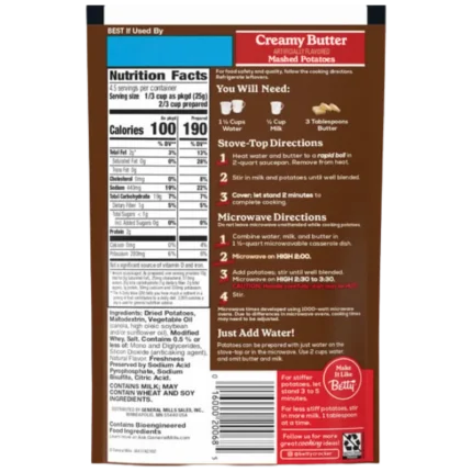Made with real potatoes, Betty Crocker Creamy Butter Mashed Potatoes have an improved recipe and buttery twist on the classic mashed potatoes you love. Just add water, milk and butter and you have an easy side dish the whole family will enjoy all you need to do is boil, stir, and let it sit before serving. Keep these instant creamy butter potatoes as a pantry staple to add your favorite warm comfort food to any meal.