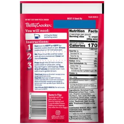 Do pizza night at home with Betty Crocker Pizza Crust Mix and make the perfect pizza dough every time with this easy-to-use mix. Just add hot water to pizza crust mix, let rest for five minutes, add toppings and bake! Your family will enjoy delicious pizza in under 30 minutes. Customize your pizza pie with cheese, veggies, meats and more!