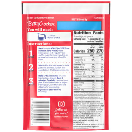 When that chocolate craving hits, you need to make sure your pantry is stocked with treats to satisfy your taste buds. The Betty Crocker Chocolate Chip Muffin Mix is the ideal way to have a home-baked chocolate chip muffin in minutes. Easy to make and take on the go, this muffin mix makes an easy morning treat or a delightful snack that the whole family will enjoy.