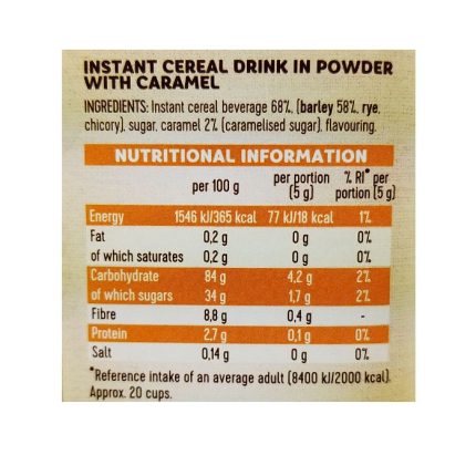 Barley Cup Cereal Drink With Caramel is the natural choice for those who like tea and coffee but are trying to cut down on the amount of caffeine in their diet. Made only from wholesome roasted barley, rye, and chicory. A naturally refreshing caffeine-free instant cereal drink. With the addition of caramel, it offers a deliciously mild, sweet flavour and also provides a source of dietary fibre.