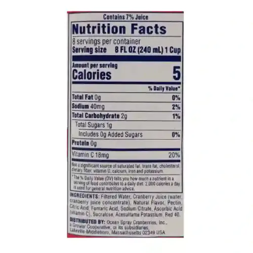 This product is a low-calorie cranberry drink made with real cranberry juice and sweetened with Splenda. It is a refreshing and healthy alternative to sugary drinks.