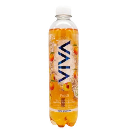 Viva Sparkling Water Peach, because plain water is just tasteless! Enjoy this lightly carbonated, sparkling Peach flavoured water, which offers the health-conscious, a natural tasting, low-calorie, thirst-quenching beverage. Drink Viva and satisfy your thirst for life! Net Weight – 16.9oz (500ml)