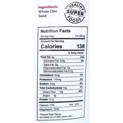 Chia is considered a superfood since it is an excellent natural vegan source of Omega 3 fatty acids, antioxidants, dietary fiber and protein. A regular consumption of Chia seeds helps reduce cholesterol and inflammation, may help to maintain a healthy body weight, normal blood sugar levels, regularity and brain function.