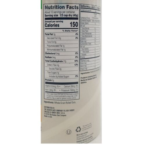 Quaker Oats Old Fashioned Oats are a classic and versatile type of oats that are a staple in many households. They are made from 100% whole grain oats and are naturally cholesterol and trans-fat free. Old Fashioned Oats are a great source of fiber and provide long-lasting energy to help keep you going all day long. They can be prepared on the stove or in the microwave, and are a blank canvas for adding your favorite flavors and toppings.These oats are a classic breakfast option, but can also be used in baking and cooking. They are versatile, wholesome, and delicious, making them a great choice for any meal of the day. Order your Quaker Oats Old Fashioned Oats today and enjoy a classic and wholesome breakfast!