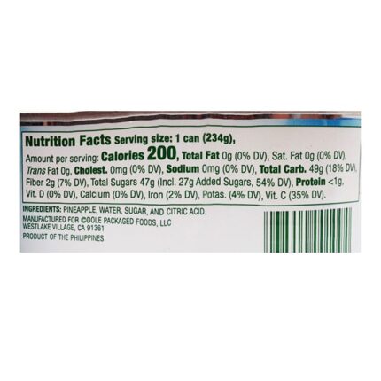 • Ingredients: pineapple, water, sugar, and citric acid.