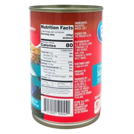 Eve Mackerel In Spring Water is a convenient and delicious option for those looking to enjoy the rich, savory flavor of mackerel without any added oils or preservatives. The mackerel is carefully selected and canned in spring water to preserve its natural taste and texture and can be enjoyed on its own, added to salads, sandwiches, pasta dishes, or used in various recipes to enhance the flavor of your meals. With its high protein content and omega-3 fatty acids, canned mackerel in spring water is a nutritious and satisfying choice for seafood lovers.