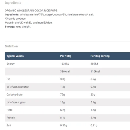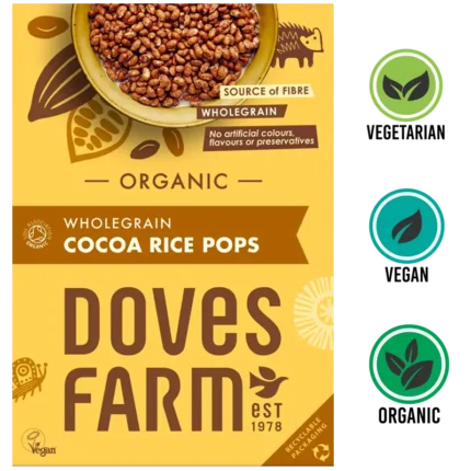 Delicious, chocolatey organic wholegrain cocoa rice pops, made with organic rice covered in premium organic cocoa, for a scrumptious breakfast sure to be loved by the whole family. Plant based and full of wholegrains these Cocoa Rice Pops contain no artificial colours, flavours or preservatives and are a source of fiber.Net Weight: 300g