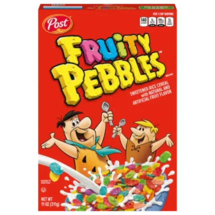 Fruity Pebbles breakfast cereal is packed with fruity flavor. Each spoonful of sweetened crispy rice cereal delivers intense fruity goodness. This delicious gluten-free cereal has been a family favorite for over 40 years—great for both adults and kids. Excellent source of 10 essential vitamins and minerals per serving. Pour a bowl with milk or pack a bag for a work snack, school lunchbox, or party treat!