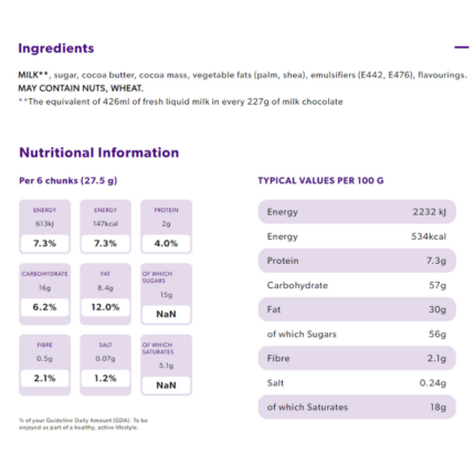 Our classic bar of deliciously creamy Cadbury Dairy Milk, milk chocolate is made with fresh milk from the British Isles and Ireland. A mouthful of “mmmm” in every piece! Enjoy a square or two and share with your friends..or not!