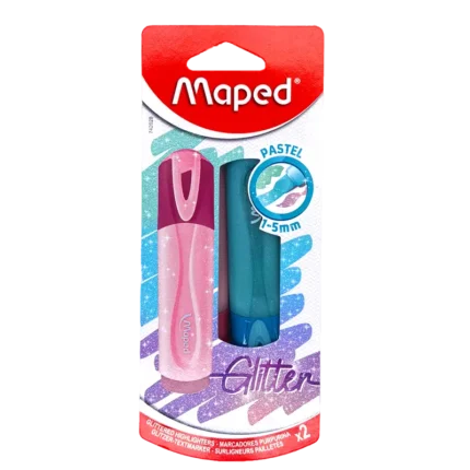 Add a bit of shimmer and shine to your notebook or planner with Maped Pastel Glitter Highlighter. Featuring a water-based ink formulation that is infused with glittering particles allowing for a fabulous shimmer in your next creative project. This chisel tip set includes comes in blue, purple, green and pink glitter highlighter.