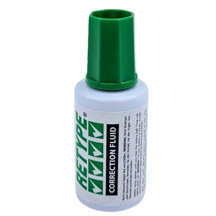 Correction fluid also known as correction liquid or white‑out is an opaque, usually white liquid applied over typing or handwritten errors to mask them. Once dry, the surface can be rewritten or retyped over. It typically comes in a small bottle with a brush or foam‑tip applicator attached to the cap .