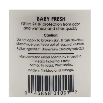 - Baby fresh has a sweet, soft powder oriental scent that opens with bergamot, cosmetic aldehydes resting upon notes of ylang, rose, geranium and cinnamon.