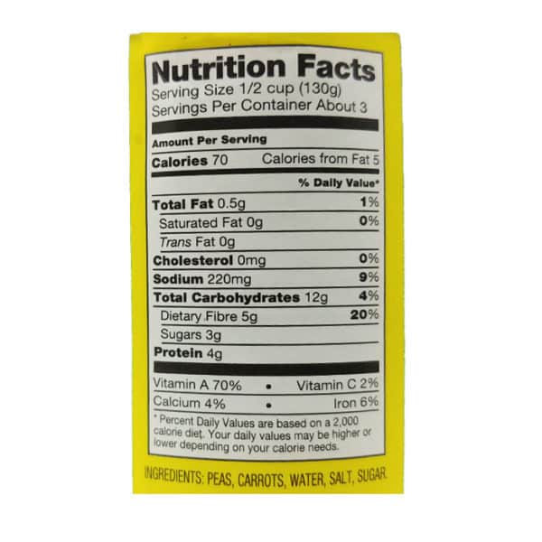 This tender, ready-to-eat mix of peas and diced carrots is perfect to add to your fried rice, potato salad or just about anything! They are an excellent source of fibre, vitamin A, vitamin C, zinc, thiamin, and vitamin K