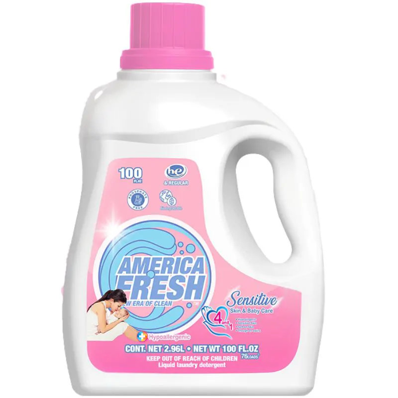 Protect your skin while keeping your clothes clean with American Fresh Detergent Sensitive (2.96 Liters). Specially formulated for those with sensitive skin, this hypoallergenic detergent is free from dyes and harsh fragrances—yet still strong enough to remove dirt, stains, and odors from your laundry.