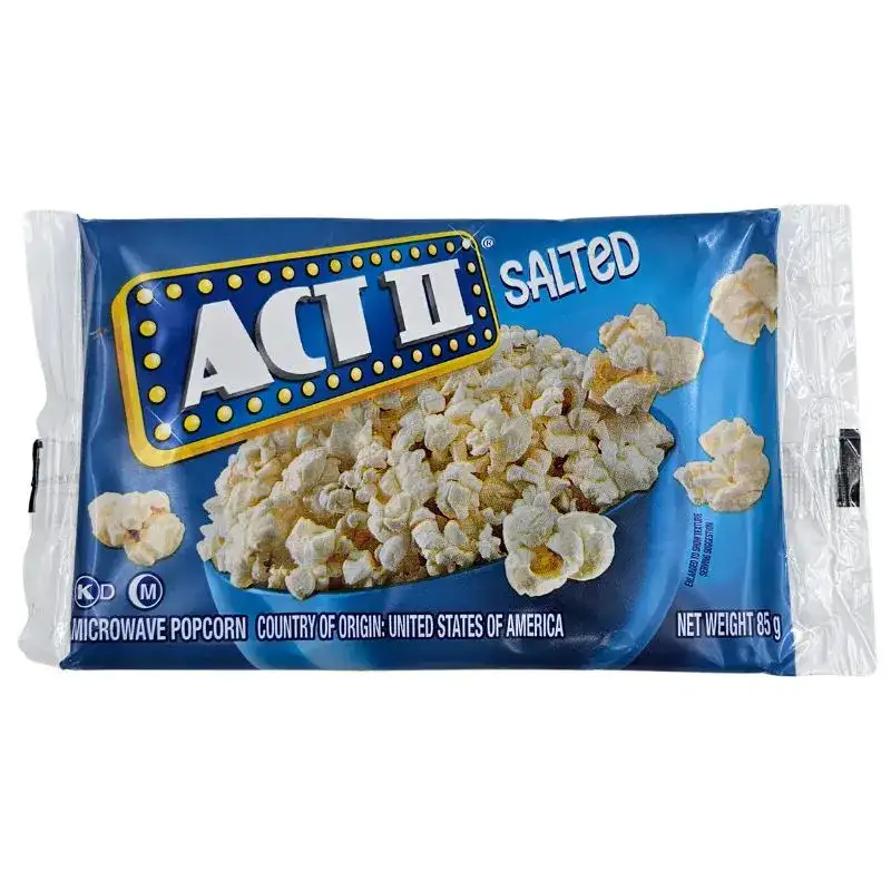 A convenient, microwave-ready bag of ACT II Salted Popcorn, crafted from 100% whole-grain kernels. Perfectly portioned for a solo snack or to share during a cozy movie night, this 85 g pack delivers classic, lightly salted popcorn with optimal crunch and flavor.