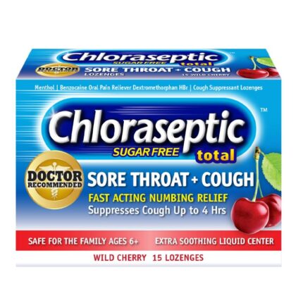 Chloraseptic Total Sugar-Free Wild Cherry Lozenges provide fast, effective sore throat and cough relief. The Chloraseptic lozenge relieves on contact while its liquid-filled center soothes.