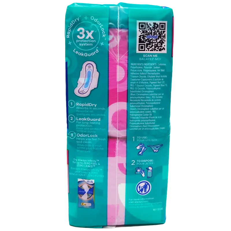 Always Ultra Thin, regular pads with flexi-wings have a flexible design to protect comfortably and move with you. Leak guard core absorbs in seconds for up to 8 hours of protection with fresh scent to help give you a long-lasting clean-and-dry feeling.
