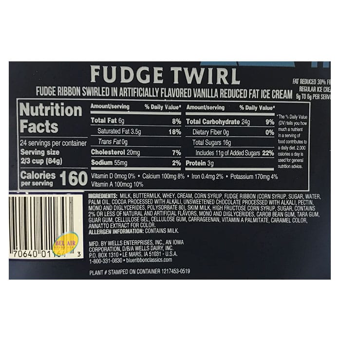 Nothing can beat the taste of Blue Ribbon Fudge Twirl Ice Cream. Classic artificially flavored vanilla reduced fat ice cream with a thick fudge ribbon swirl. Perfect for parties! Break out the ginormous scoopers, bowls, and spoons. Time to pop the lid off and get the party started!
