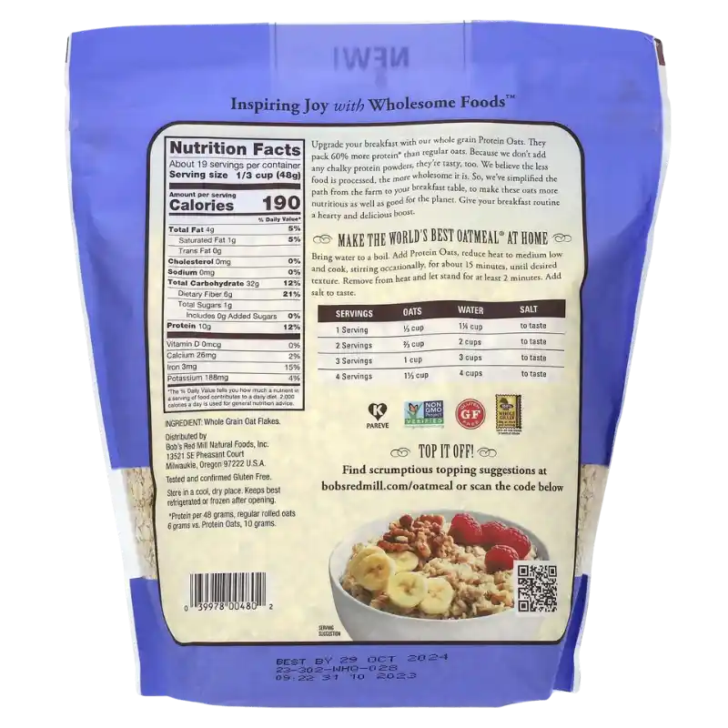 Upgrade your breakfast with this whole grain Protein Oats, made with just one simple ingredient – whole grain rolled oats. These oats contain 60% more protein than regular oats, with 10g of protein per serving. They are gluten-free and non-GMO project verified. Our Protein Oats are 100% whole grain, with 48g or more per serving. We believe in inspiring joy with wholesome foods, and our Protein Oats are a delicious and nutritious way to start your day. Say goodbye to chalky protein powders, and enjoy a hearty and delicious breakfast with our Protein Oats.