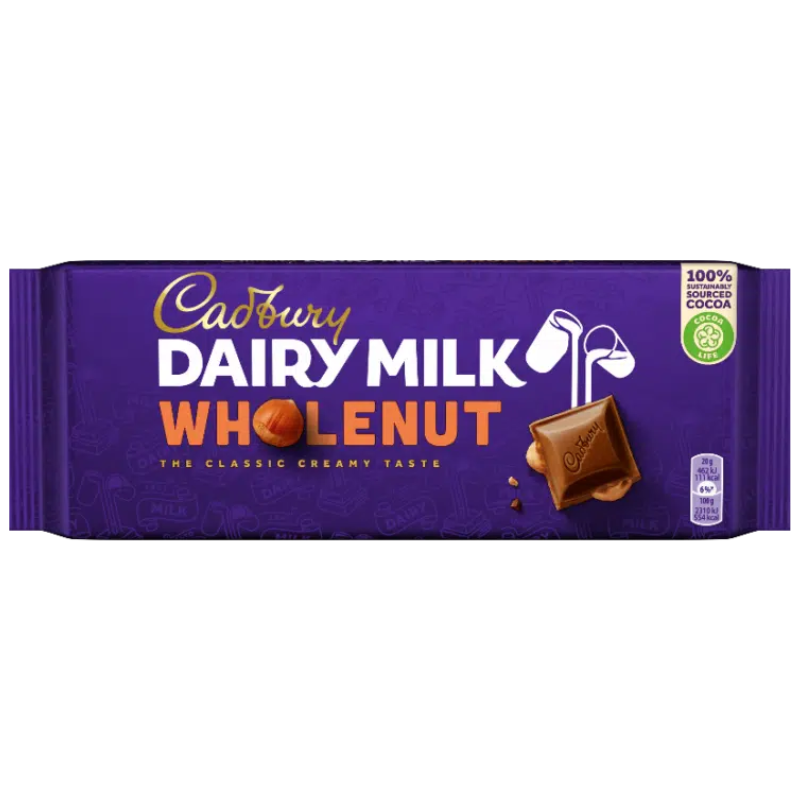 Cadbury Dairy Milk Whole Nut offers that blend of nutty crunch and smooth milk chocolatey goodness that will just tantalize your taste buds! Savour the crunchy deliciousness of whole hazelnuts lovingly smothered with Cadbury’s signature chocolate.