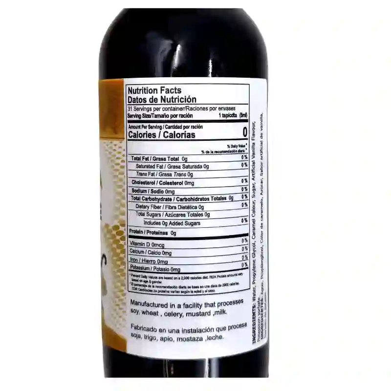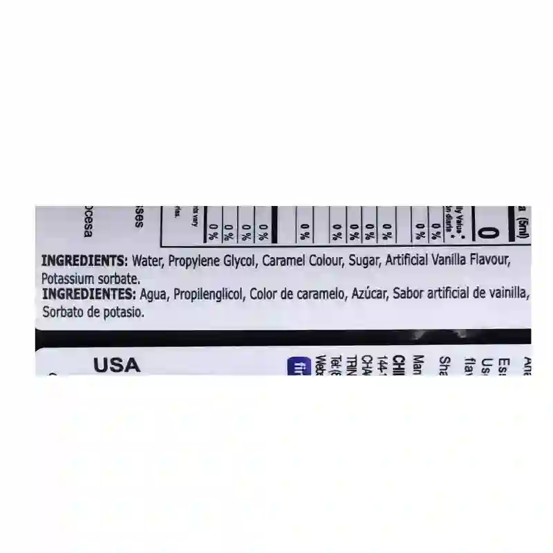 INGREDIENTS: Water, Propylene, Caramel colour, Sugar, ArtificialVanilla flavour, E202 (preservative).