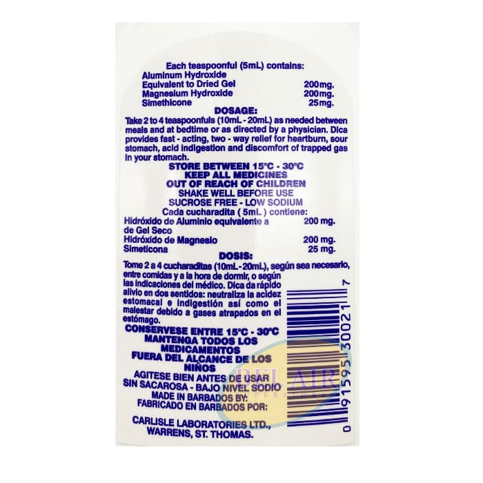 Dica Antacid Liquid is used to treat the symptoms of too much stomach acid such as stomach upset, heartburn, and acid indigestion. It is also used to relieve symptoms of extra gas such as belching, bloating, and feelings of pressure/discomfort in the stomach/gut. Simethicone helps break up gas bubbles in the gut.