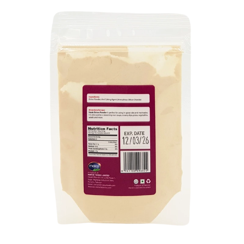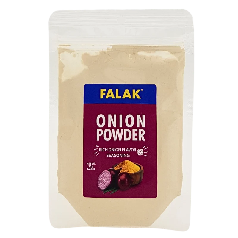 Falak Onion powder is perfect for using in spice rubs and marinades. It is also great as a seasoning over soups, creamy dips, pizza, salads and more.
