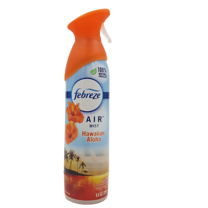 Febreze Air Mist Hawaiian Aloha Scent is an 8.8oz aerosol spray that freshens the air with a tropical scent.