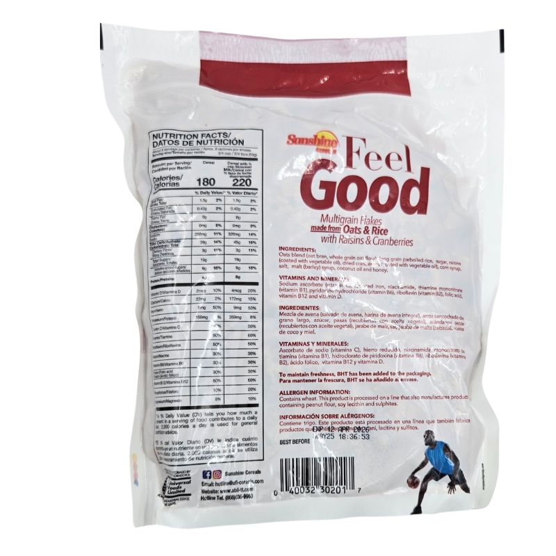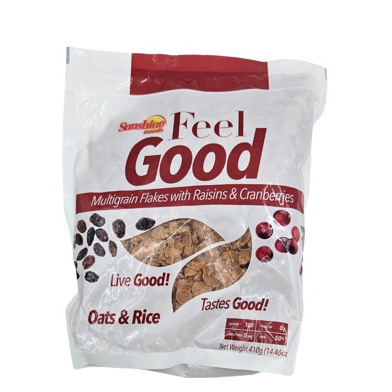 Sunshine Cereals Feel Good Raisin & Cranberry is a 410g cereal that offers a delicious blend of raisins and cranberries. Packed with fiber, vitamins, and antioxidants, this cereal provides a nutritious and satisfying breakfast option. Its key features include a high fruit content, no added sugar, and a crunchy texture. The unique selling points of this product are its natural ingredients, great taste, and health benefits.