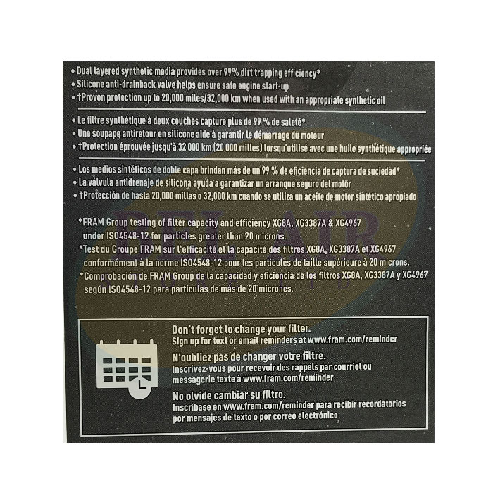 FRAM Ultra Synthetic Oil Filter with Sure Grip is the proven leader in ultimate engine protection for today’s cars and light duty trucks. Ultra Synthetic is engineered for drivers who require maximum engine protection and use synthetic motor oils for extended 20,000 mile change intervals.