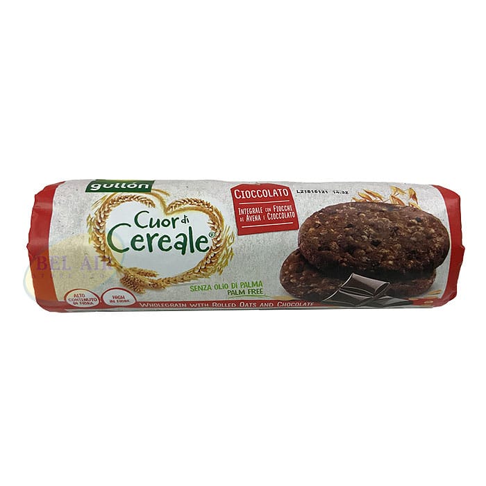 Gullon Whole Grain Rolled Oats and Chocolate Cookies perfect as a healthy snack or compliment your breakfast. Made with whole grain and rolled oats with chocolate. Perfect blend of healthy and sweet. High in fibre.