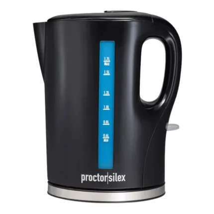 Conveniently boil and serve hot water for tea, hot cocoa, French press coffee, and ramen with the Proctor Silex 1.7 Liter Cordless Electric Kettle. The kettle has 1500 watts to boil up to 1.7 liters of water faster than a microwave and safer than a stovetop. Make a quick, hot cup of tea or instant coffee anytime without the wait — perfect for hectic mornings.