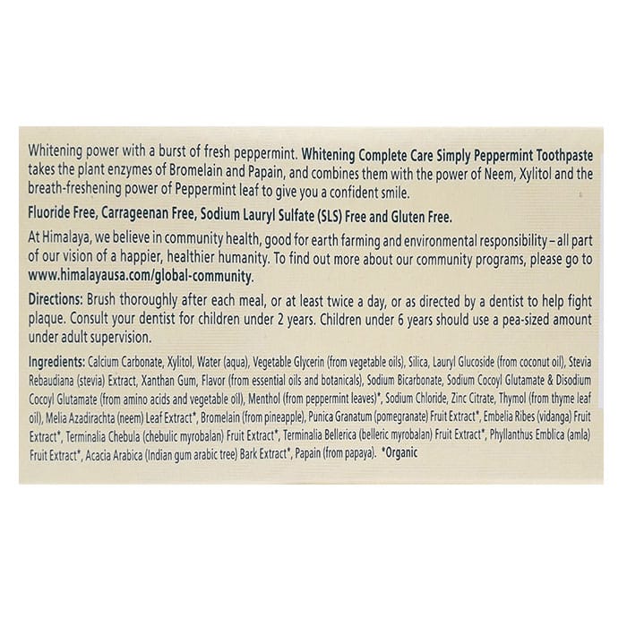 Himalaya Whitening Toothpaste Simply Peppermint awakens your mouth and leaves you with irresistibly fresh breath, while gentle ingredients bring you brighter teeth and a winning smile.  Finally, a clean toothpaste with no unwanted extras, yet it still tastes and foams wonderfully!