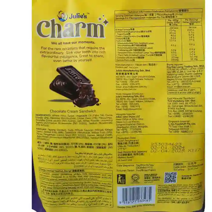 Julie’s Charm Dark Chocolate Sandwich is a delicious snack that features rich dark chocolate sandwiched between two crispy biscuits. The key features of this product include its indulgent taste, convenient packaging, and satisfying crunch. The benefits of Julie’s Charm Dark Chocolate Sandwich include being a perfect treat for chocolate lovers on the go, a great source of energy, and a satisfying snack for any time of day. Its unique selling points are the high-quality ingredients used, the perfect balance of sweetness and crunch, and the convenient size for snacking.