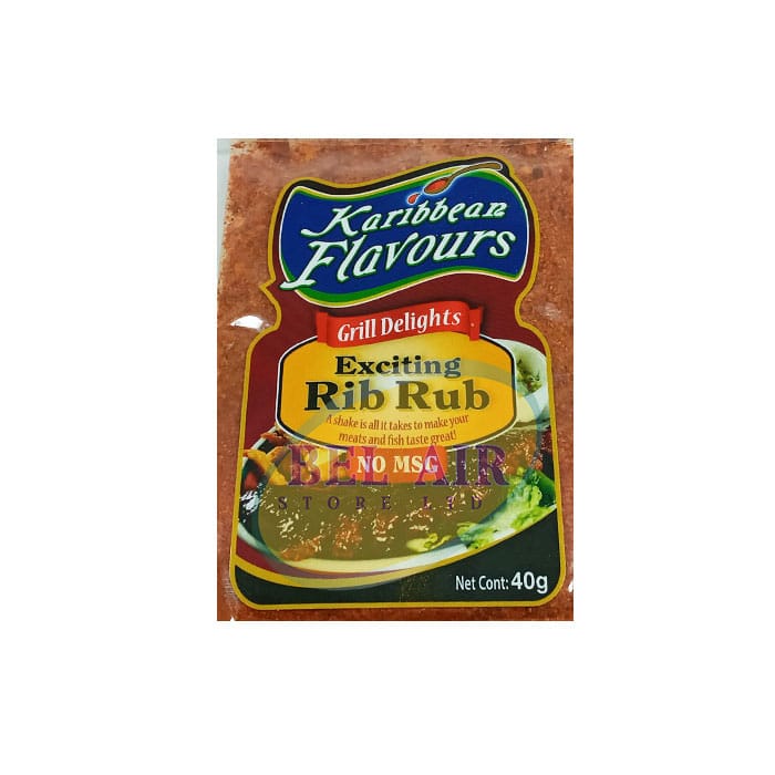 Karibbean Flavours Exciting Rib Rub, a shake is all it takes to make your meats great. A mix of paprika, black pepper, nutmeg, etc.