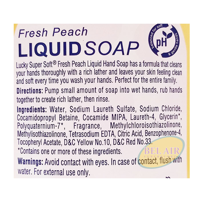 Lucky Super Soft Liquid Hand Soap is carefully formulated to be pH-balanced without any harsh chemicals, so it provides a deep clean while leaving your hands soft and moisturized. Infused with the sweet scent of fresh peaches, this liquid hand soap is safe to use for both young and old alike.