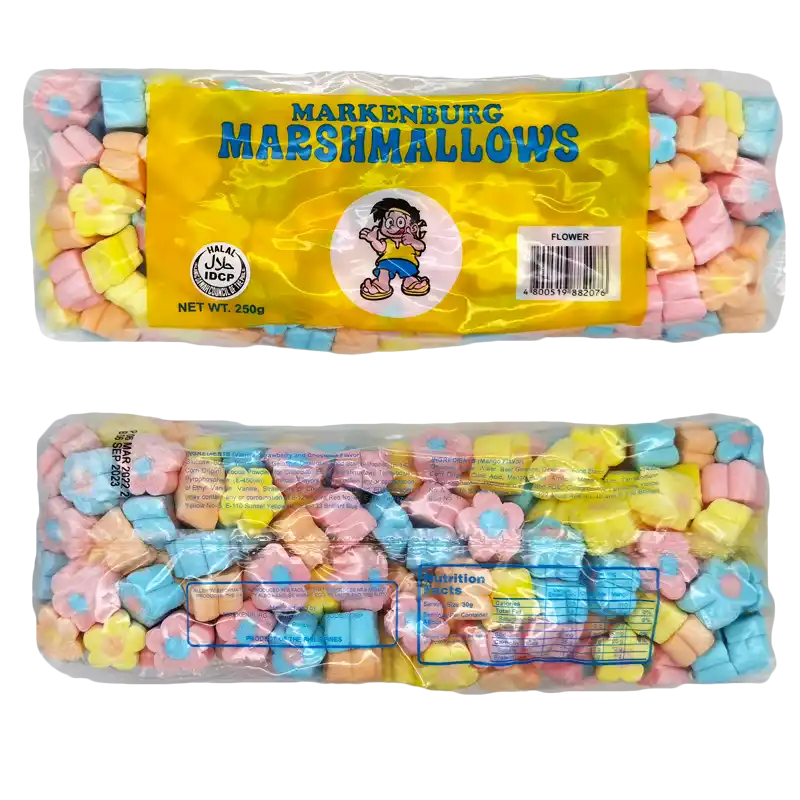 Markenburg Marshmallows Mini Flower marshmallows are soft, chewy, and with assorted colours. Great for snacks, cocoa and coffee floats, ice cream toppings, cake, and dessert mixes, and more! Enjoy the soft and sweet taste!