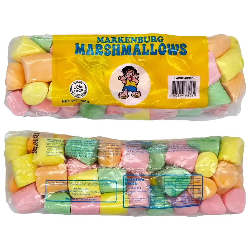 Markenburg Marshmallows large assorted marshmallows are soft, chewy, and with assorted colours. Great for snacks, cocoa and coffee floats, ice cream toppings, cake, and dessert mixes, and more! Enjoy the soft and sweet taste!