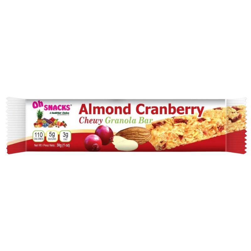 Oh! Snacks Almond Cranberry Chewy Granola Bar– Amazing chewy goodness of crunchy almonds and sweet cranberries both mixed into this delicious granola bar. Make this a healthier choice for your snack options.
