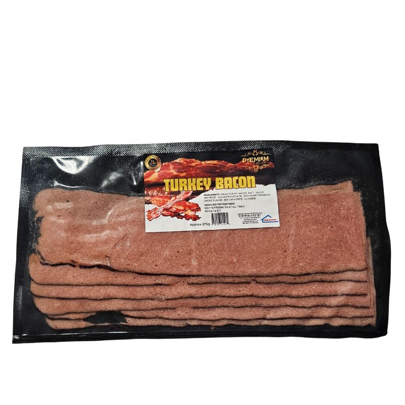 Enjoy the savory taste of this delicious Turkey Bacon with a healthier twist!  Premium Sliced Turkey Bacon (275g) delivers the smoky, crispy flavor you love—made from lean turkey meat for a lower-fat, high-protein for a healthy and delicious meal.