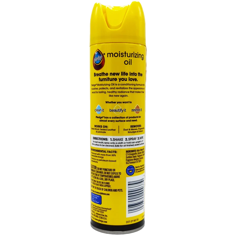 Pledge Moisturizing Oil is a conditioning formula that nourishes, protects, and revitalizes the appearance of wood for lasting, healthy radiance that makes it feel like new again.