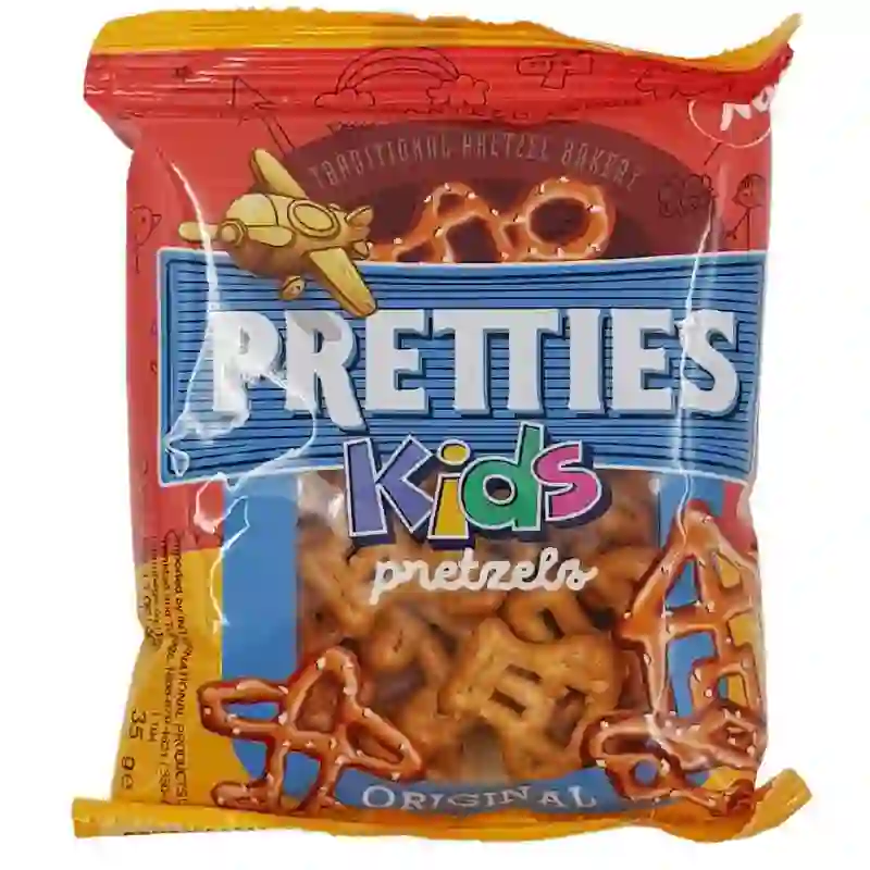 Pretties, Kids Pretzels (35g) is a snack product designed for children. It contains 35 grams of pretzels that are likely to be in fun shapes or sizes to appeal to kids.