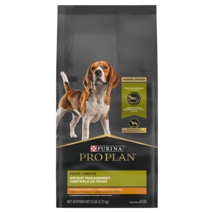 Purina Pro Plan Adult Weight Management Chicken & Rice Formula is a specialized dry formula for overweight and less active adult dogs. The protein-to-fat ratio is optimized to maintain muscle mass during weight loss.