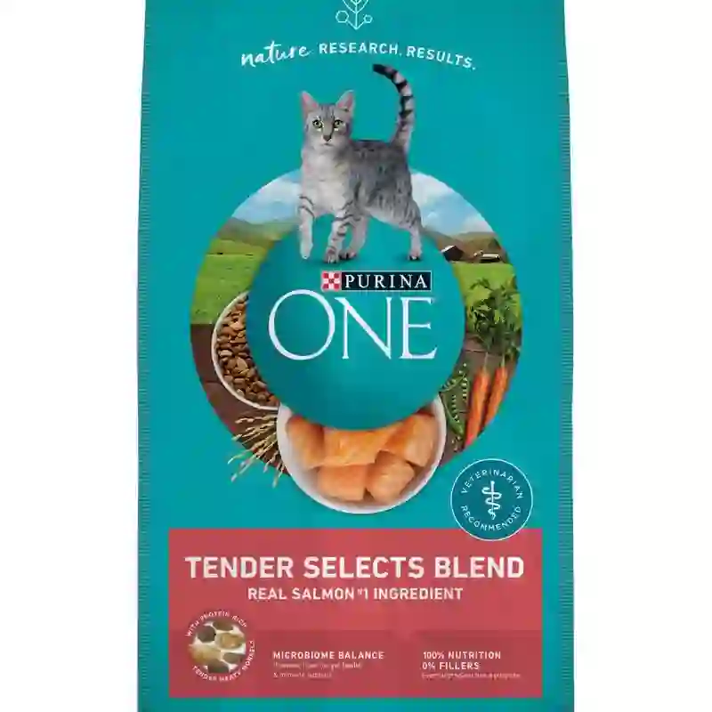 Purina ONE Tender Selects Blend With Real Salmon Cat Food is your cat’s premium nutritional choice. The specially formulated crunchy kibble reduces plaque buildup and whitens teeth. Made with real salmon, vitamins and minerals, this dry cat food supports your cat’s optimal health, both inside and out.