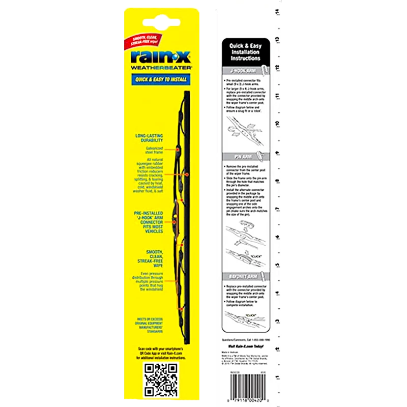 Protect your windshield with the best! The Rainx Weatherbeater provides a smooth, clean, streak-free wipe by using embedded friction reducers which resist cracking, splitting and tearing caused by heat, cold windshield washer fluid and salt. and multiple pressure points. With a galvanized steel frame, this wiper blade is constructed to last. It features a pre-installed ‘J-hook’ arm, making it the perfect fit for your car.