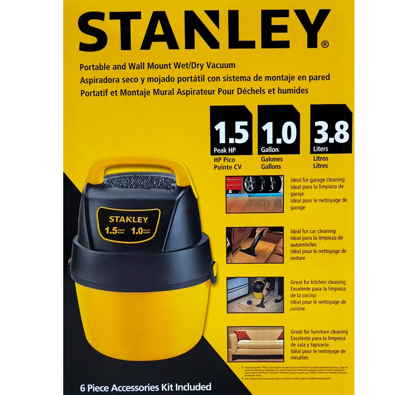 The Stanley 1.0 Gallon Wet/Dry Vacuum is a compact, lightweight and powerful portable vacuum cleaner designed for everyday cleanup tasks at home, in the garage, workshop, or vehicle. It combines wet and dry suction capabilities so you can tackle both liquid spills and dry debris with a single unit.
