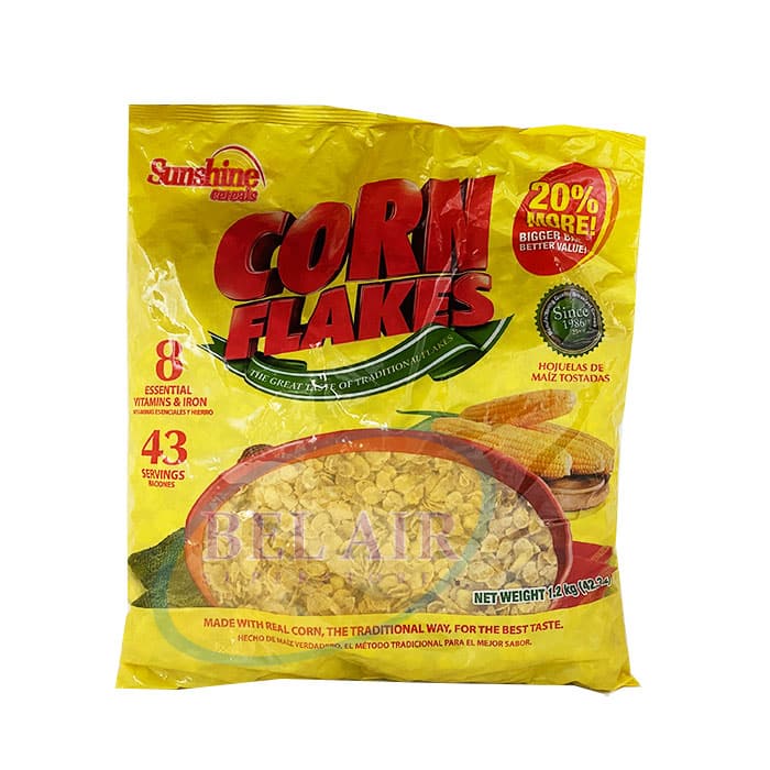 Sunshine Cereal Corn Flakes  provides you with 8 essential vitamins and iron for a healthy and nutritious breakfast bowl or snack.  Get better value and 20% more in this 1.2kg bag. This delicious cereal is made from real corn in a traditional way, giving you great taste in each bite.