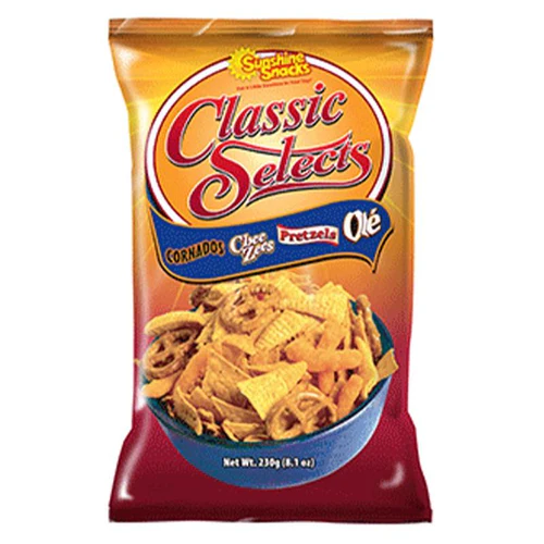 Sunshine Snacks Classic Selects, is a delicious and salty mix of Cornados, Chee Zees, Pretzels and Ole. Perfect for serving at parties or for sharing with friends. You will never get enough of all this tasty and crunchy goodness!