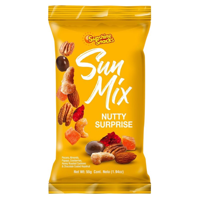 Sunshine Snacks Sun Mix Nutty Surprise, get in the mix with a nutty surprise. You’re in for a nutty surprise. An appetizing yet healthy combo of cashews, hazelnuts, almonds and more, makes the perfect afternoon snack. If you haven’t tried Sun Mix’s Nutty Surprise yet, grab some today.